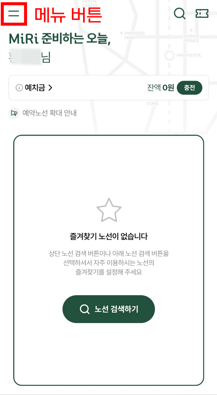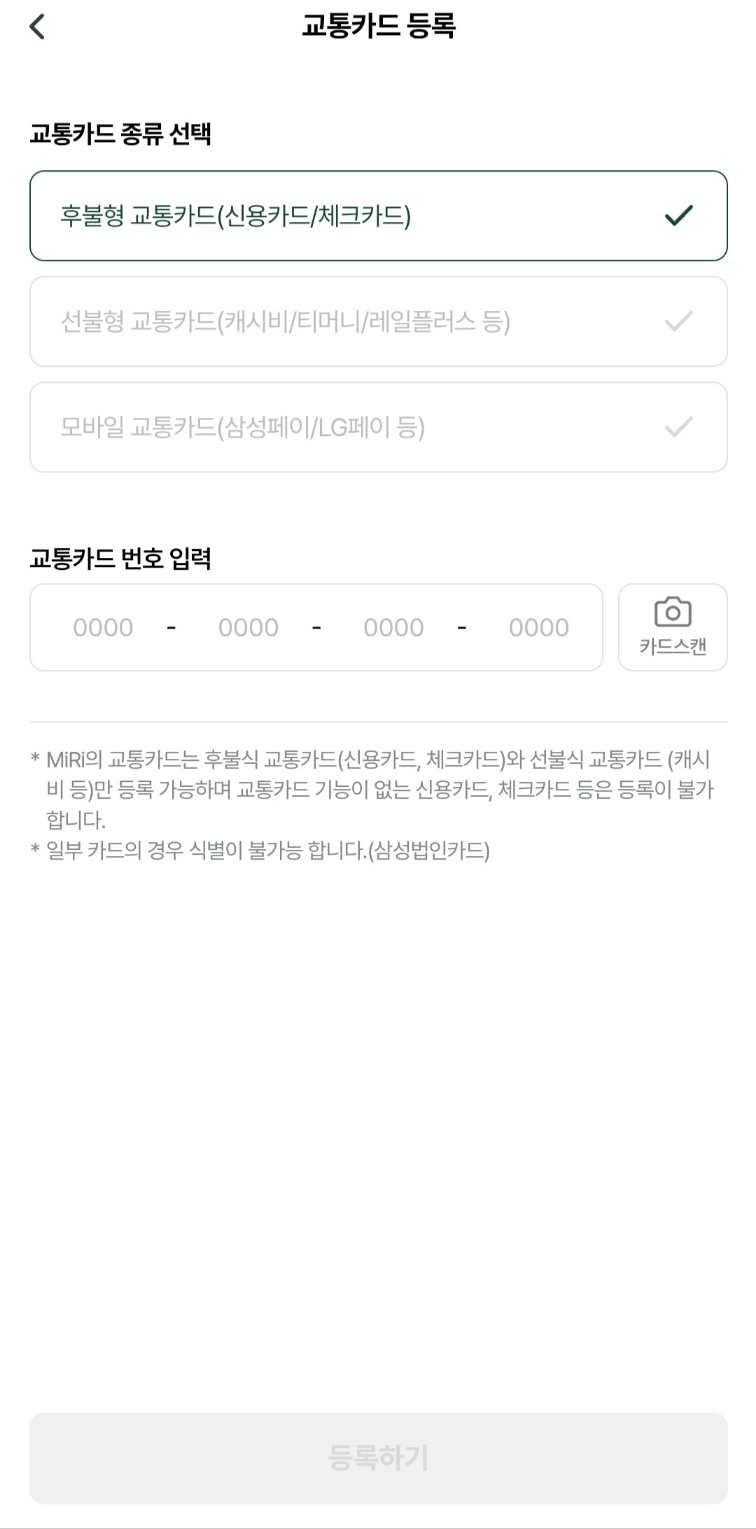 메인 화면에서 왼쪽 상단에 있는 메뉴 버튼을 누르면 교통카드 등록을 할 수 있습니다. 후불형, 선불형, 모바일 교통카드로 등록이 가능한데 Miri 애플리케이션에 등록한 카드로만 버스 탑승이 가능하니 반드시 등록해야 하고 카드는 여러 장 등록할 수 있으니 여유롭게 해 두는 걸 추천드립니다.