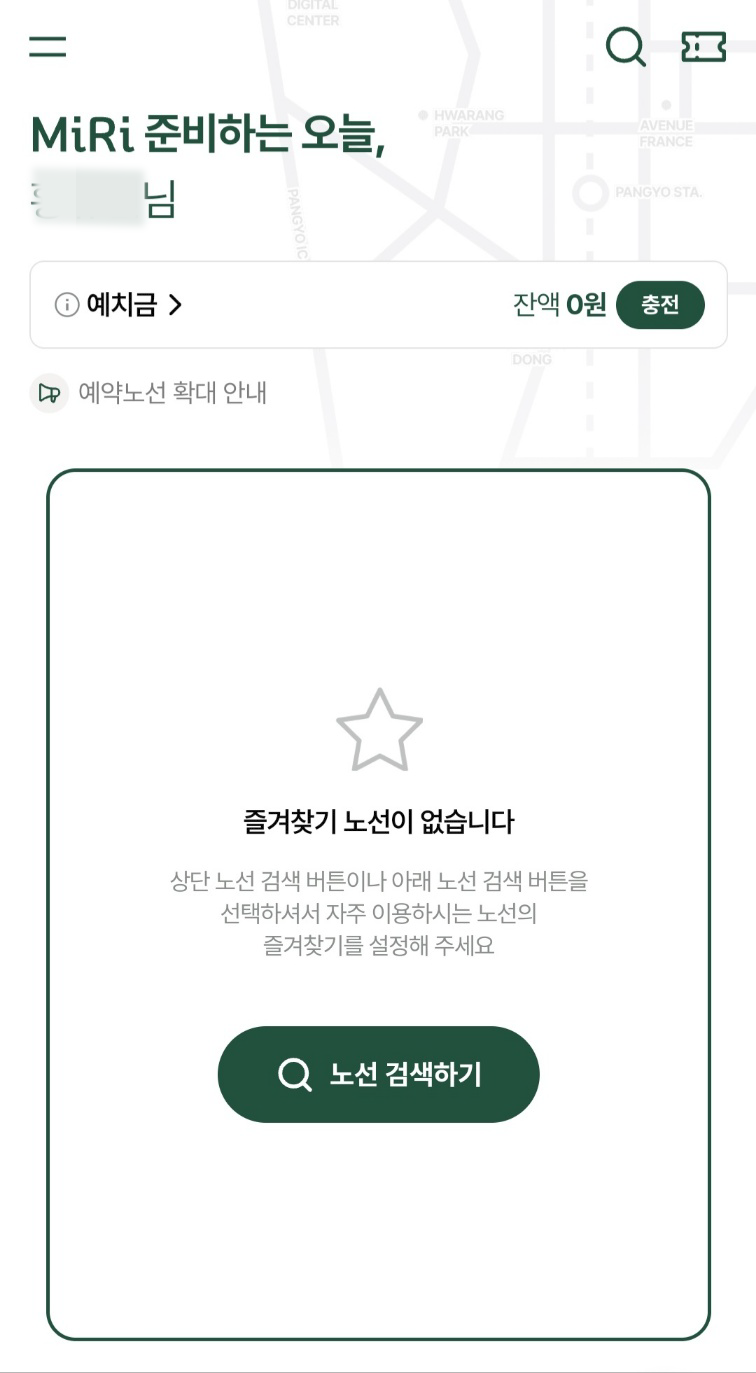 메인 화면에는 예치금이라는 것이 있는데 예치금을 미리 충전해야 버스 예약이 가능합니다. 이유는 좌석을 예약한 뒤 서비스를 이용하지 않는 사람들에게 페널티를 주기 위해 이 제도를 실시하고 있습니다.