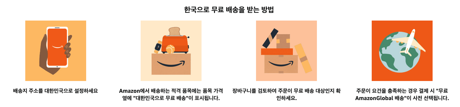 최소 주문금액은 49$(약 6만 7000원, 원화 결제 금액은 당시 환율에 따라 달라질 수 있음) 이상이어야 하고 배송 주소를 대한미국으로 설정하고 아마존이 배송하는 적격 품목에는 품목 가격 옆에 "대한민국으로 무료 배송"이 표시가 되고 장바구니를 검토하여 주문이 무료 배송 대상인지 확인도 가능하다고 합니다. 요건을 충족하는 경우 결제를 하면 "무료 아마존 글로벌 배송"이 사전 선택되어 한국까지 무료로 받을 수 있게 된다고 합니다. 배송 시간은 상품별로 다른데 배송 예상 날짜가 결제할 때 표시되며 상품의 재고 상황이나 배송지 위치에 따라 상이할 수 있다고 합니다.