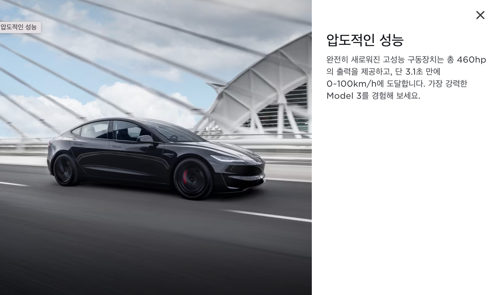 기존 모델3 마력은 480마력이었고 이번에 새롭게 출시한 모델3 퍼포먼스는 510마력(미국 기준, 한국에 공개한 마력은 460)입니다. 현대 아이오닉 5N은 650마력, 아우디 이트론 520마력, bmw ix M60 619 마력처럼 5~600마력 고성능 전기 차량들이 많이 나오고 있는 상황에서 수치적으로 낮아 보일 수 있지만 제로백은 더 빨라졌습니다. 기존 모델은 3.3초였는데 이번 모델은 2.9초(미국기준, 한국은 3.1)로 훨씬 더 좋아졌습니다.