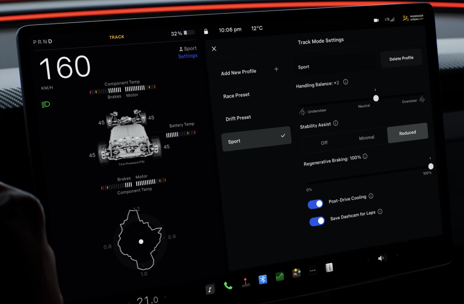 트랙모드 v3라고 새롭게 바뀐 부분이 있습니다. 구성품의 온도, 공기압, 브레이크 온도, 모터의 전륜-후륜 온도도 따로 나오고 배터리 온도도 표시가 됩니다. 트랙모드는 발동하면 모터를 식히기 위해 냉각 시스템이 엄청 빠르게 돌아갑니다. 배터리나 모든 구성품의 온도를 낮추기 위해서죠.