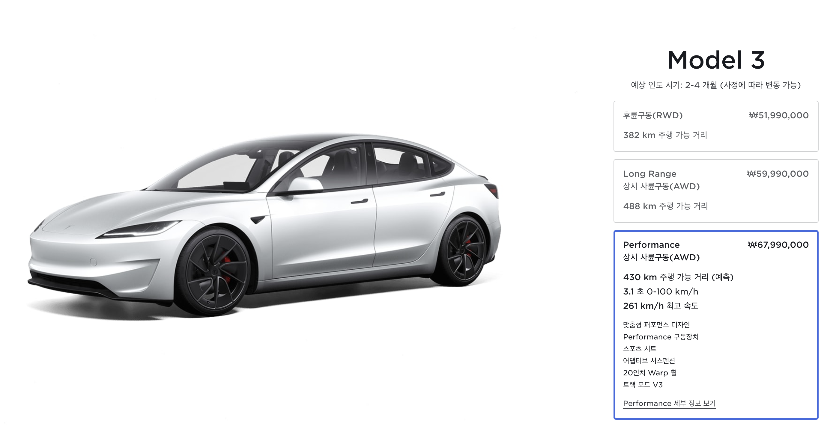 ⊙ 테슬라 모델3 퍼포먼스 가격