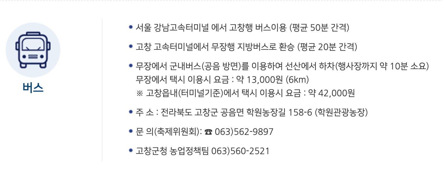 - 고창 고속버스터미널 -> 무장행 지방버스로 환승(평균 20분 간격)