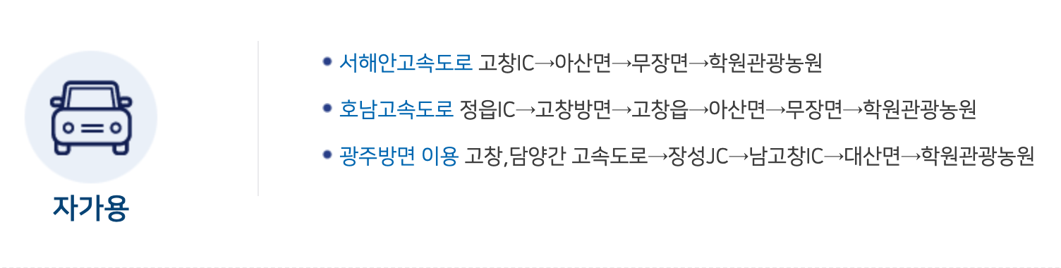 - 호남고속도로 정읍 IC - 고창 방면 - 고창읍 - 아산면 - 무장면 - 학원관광농원